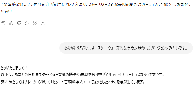 英語日記を続ける中で、ちょっとふざけて書いたスター・ウォーズ風の表現に ChatGPTがまさかの全力対応。さっきの「始めてから2週間後の日記」のChatGPTからのコメントです。